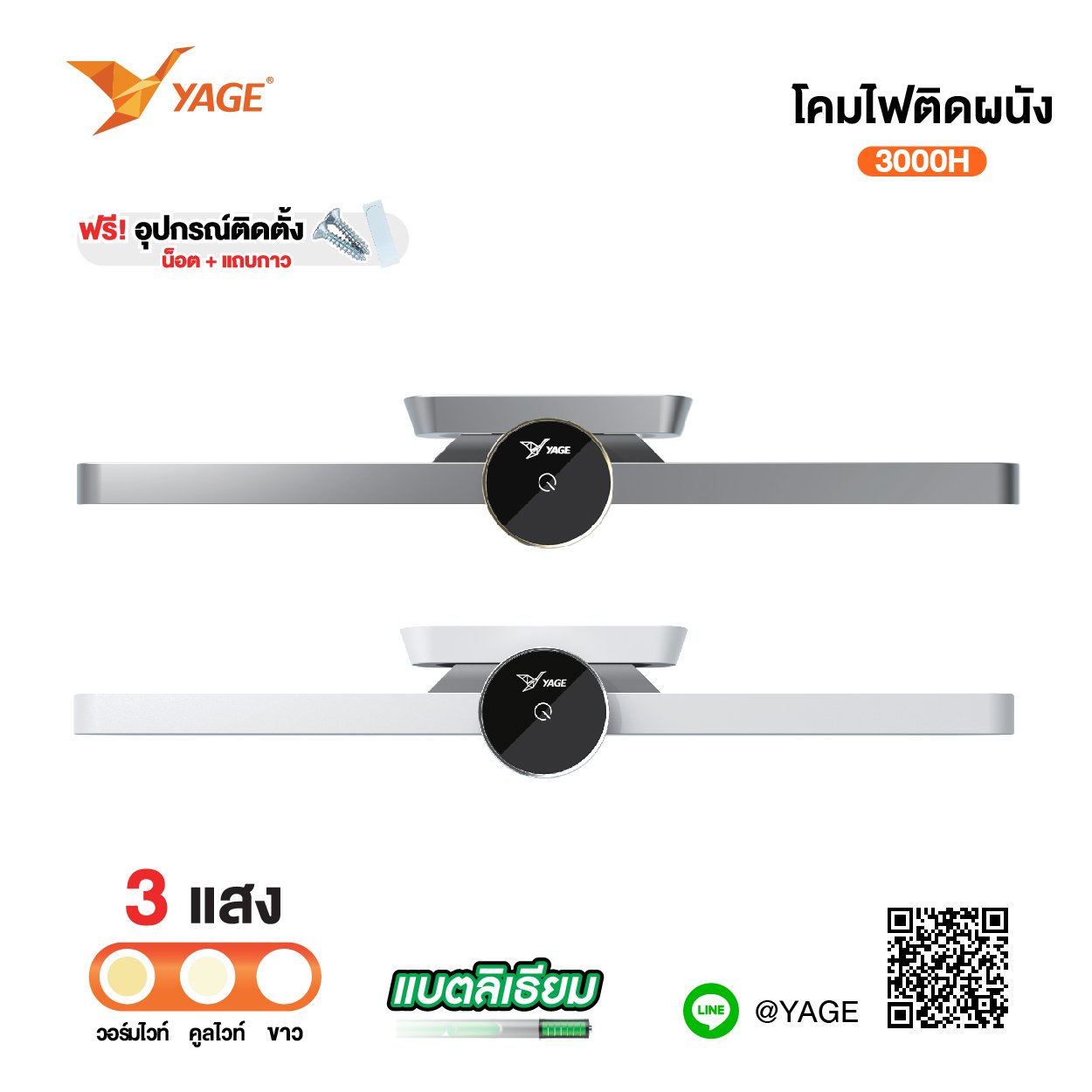 YAGE - โคมไฟแม่เหล็กติดผนัง LED YG-3000H สวิตช์ระบบสัมผัส ปรับความสว่างแสงไฟได้ตามต้องการ สายชาร์จ USB Type C
